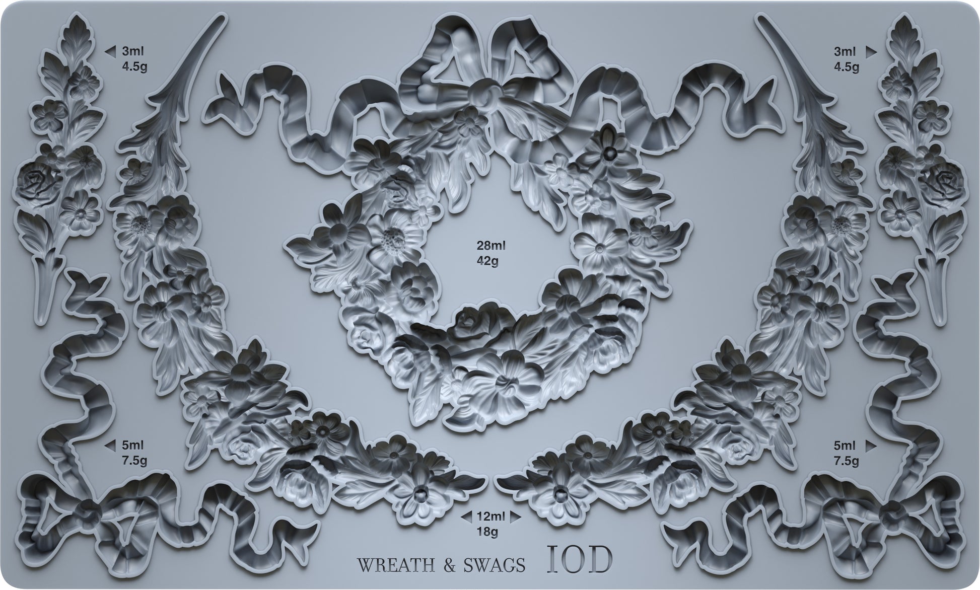 Add graceful movement and classical elegance to your projects with the Wreath & Swags Mould from Iron Orchid Designs. This 6″ × 10″ silicone mould features a beautifully layered floral wreath, flowing ribbon detail, and coordinating floral swags that bring a refined, old-world aesthetic to furniture and decorative art.